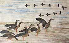 Insbesondere habe ich für mich den Kranich als ein bevorzugtes Webmotiv entdeckt. Seit meiner Kindheit sind mir diese Vögel mit ihrem auffälligen Erscheinungsbild vertraut - ihr Durchzug und ihre lange Rast im Herbst gehören hier an der Ostseeküste zum Jahresrhythmus. Ich webe die Gobelins ausschließlich frei, also ohne zeichnerische Vorlage - die Bilder entstehen spontan während des Webens auf dem Webstuhl.